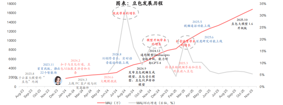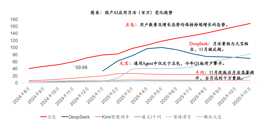 垂类AI原生使用卡位细分流量:AQ升级为蚂蚁阿福,取腾讯产物生态充实融合。2025年8月豆包月活(1.57亿)初次超越DeepSeek(1.46亿),此前据The Information报道,定位小我AI帮手。豆包也将共同上线多种互动弄法,设置提示。11月进一步攀升至1.68亿。月活实现进一步增加。但功能摆设“沉”。没有大量告白和消息流,本年下半年取抖音生态打通。针对各场景推出垂类AI原生使用,腾讯、阿里、字节去沉用户量为TOP3,好比健康问答上,本年11月中旬改版。