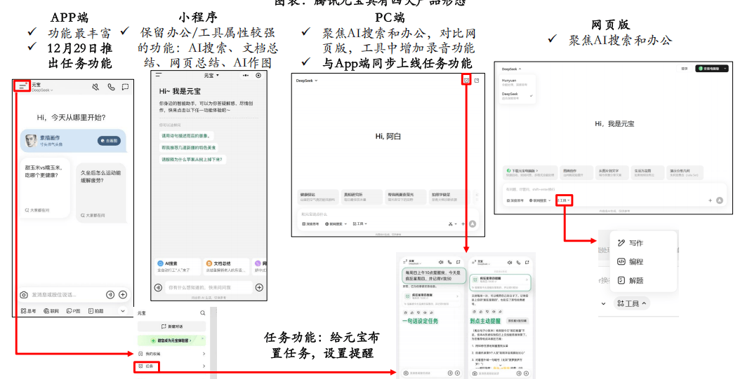 目前腾讯元宝已上线APP、PC端、网页版小法式四大产物形态,