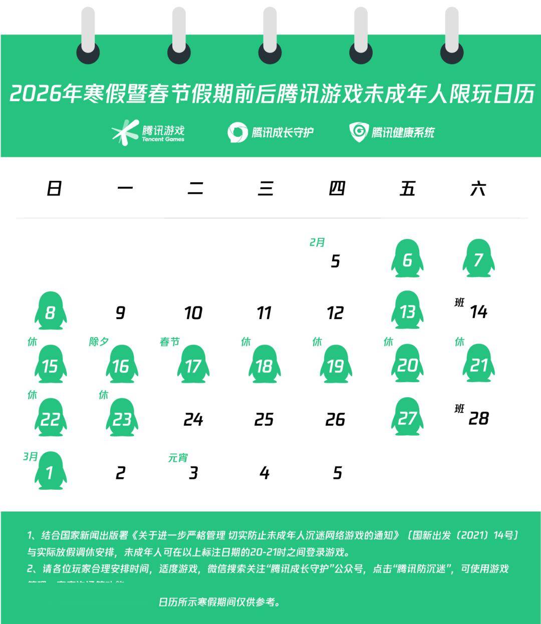腾讯逛戏今日(2 月 5 日)发布 2026 年寒假暨春节假期前后未成年人逛戏限玩通知。